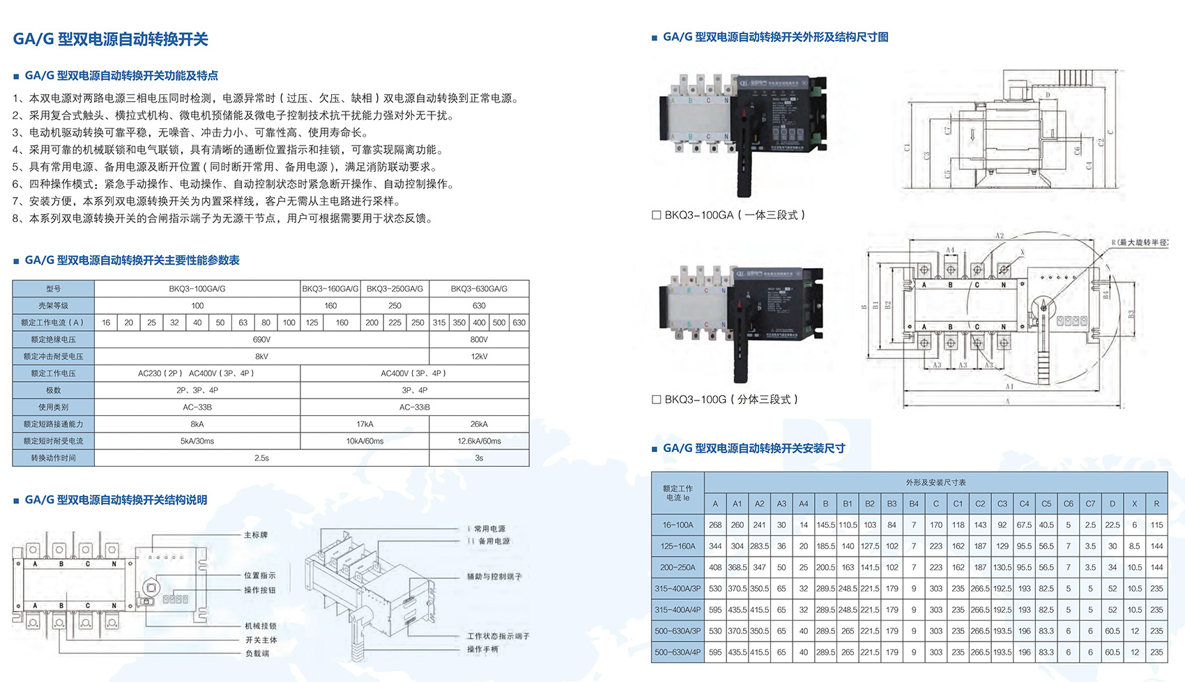 BKQ3-3200Q系列自动转换开关电器适用于交流50/60Hz,额定工作电压400V,额定电流800A至3200A的双路配电系统中,产品由开关本体与转换控制器两部分组成,本体采用电磁线圈驱动,转换速度快;转换控制器具有对两路三相电源的过电压、欠电压、缺相等故障检测功能;同时带有发电机组启、停信号输出。主要应用于医院、商场、银行、化工、高层建筑、军事设施、消防等不允许断电的重要场所。产品符合GB/T 14048.11《低压开关设备和控制设备 第 6-1 部分:多功能电器 转换开关电器》。
